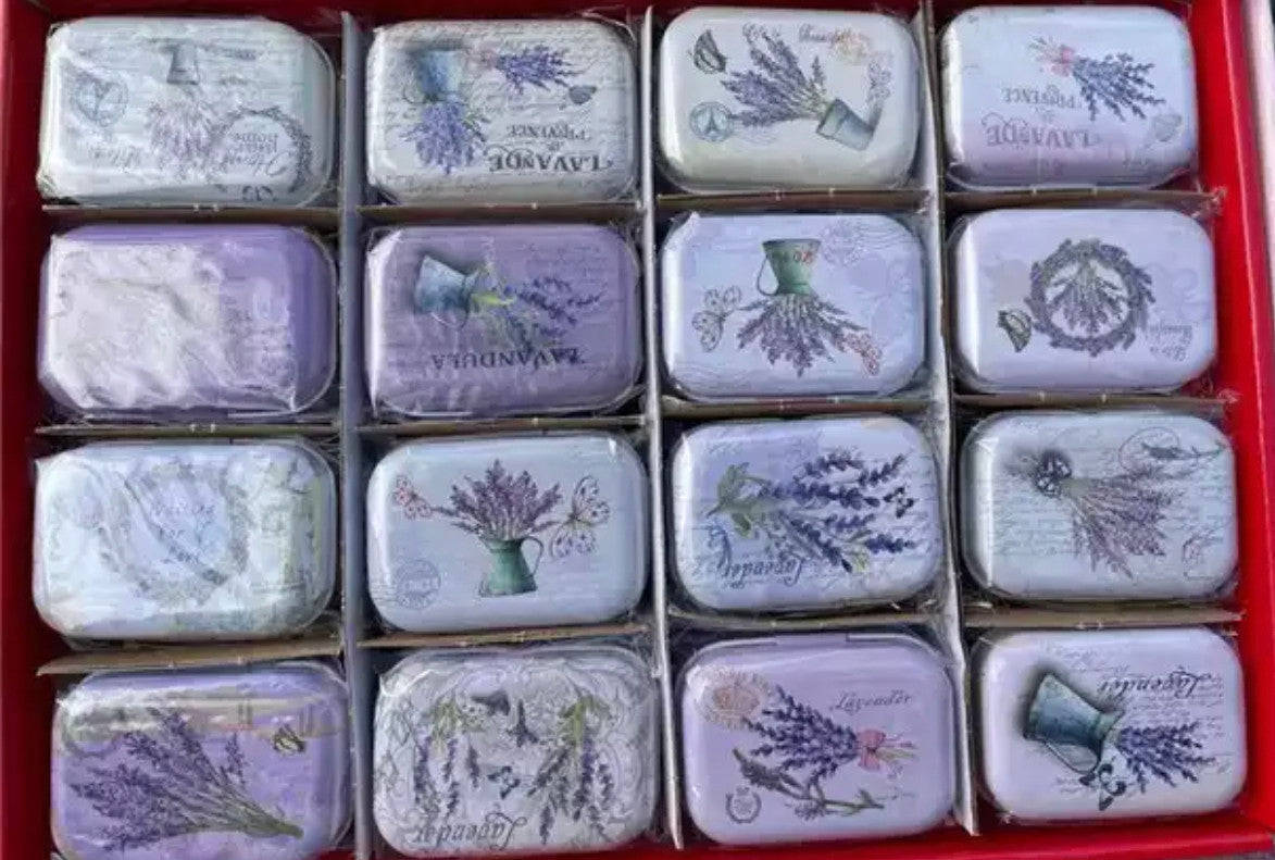 These empty lavender themed tins are simply cute and universal. Approximate size is 2"x 1.75" x .5" Assorted designs will be shipped. Tins are sold in set of 3.
