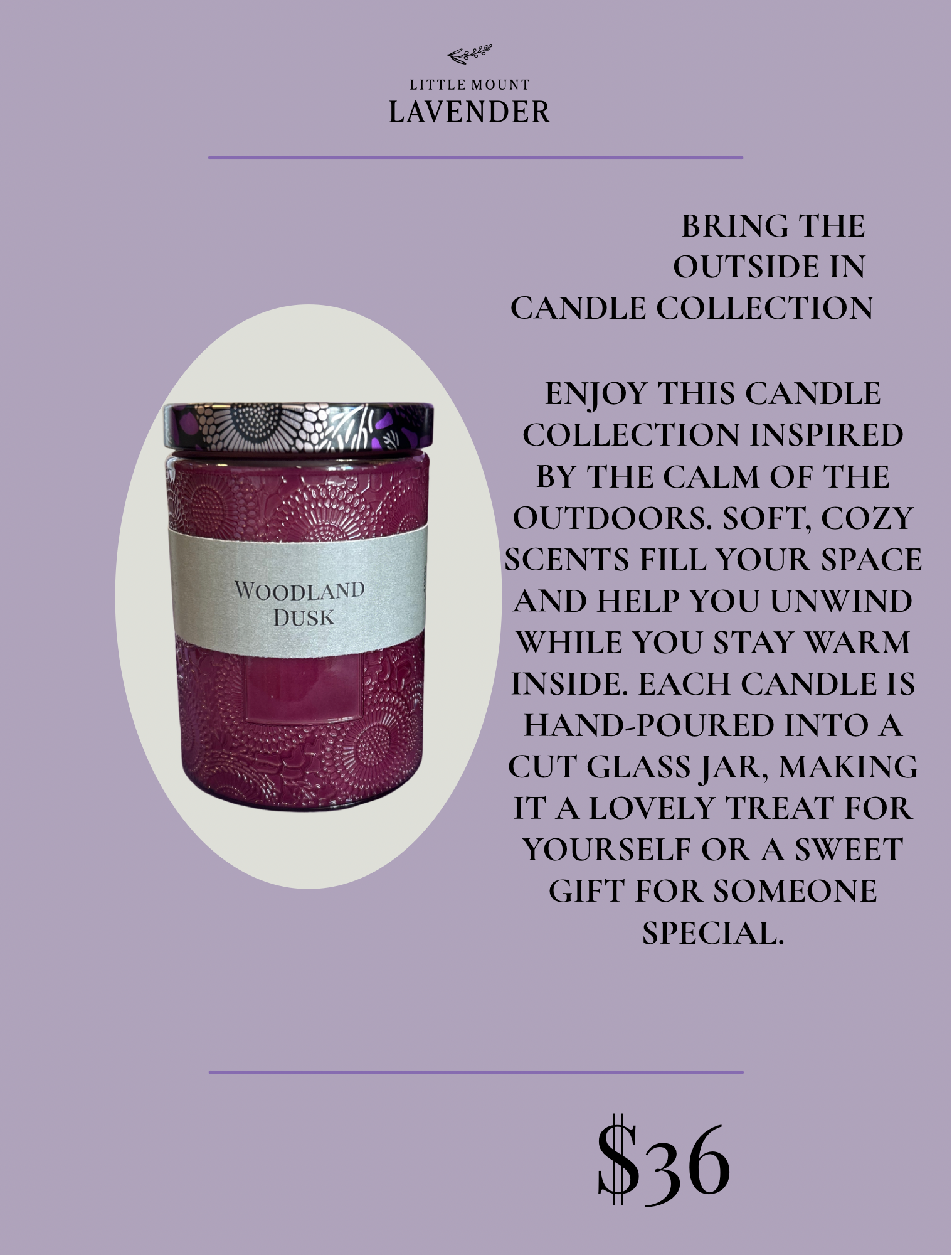 Experience the enchanting allure of our Woodland Dusk soy candle, where a contemporary scent meets timeless charm. This mesmerizing fragrance opens with vibrant notes of orange and grapefruit, beautifully intertwined with a touch of sage that elevates its earthy essence. The heart reveals a delicate blend of lavender, imparting a gentle floral and herbal essence, while the depth is enriched by oakmoss, amber, and tonka, creating a character that's both striking and profound.