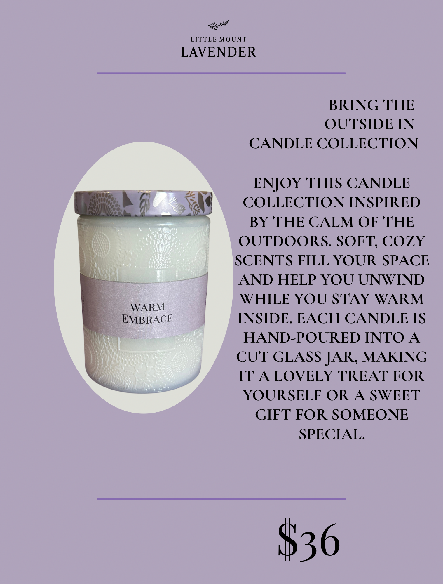 Experience the allure of our Warm Embrace Soy Candle, a contemporary twist on timeless musk. The invigorating notes of bergamot and earthy saffron create a mesmerizing fragrance that unfolds into a lush woodland blend of lily of the valley and violets, harmoniously intertwined with a warm amber heart and soothing lavender. This luxurious, gentle aroma is anchored by a robust base of dark musk and vetiver, elevated with a whisper of powder.